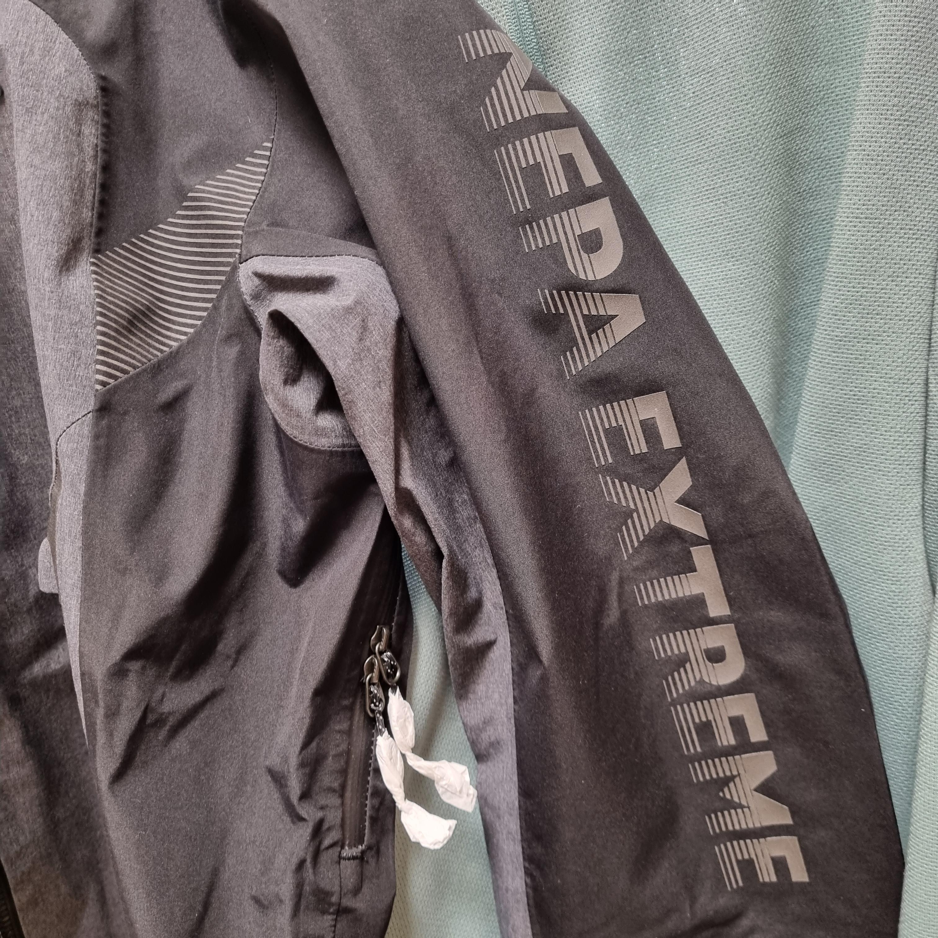 YKK 지퍼 손잡이가 종이로 쌓여있다. 소매끝은 찍찍이로 되어있다.
