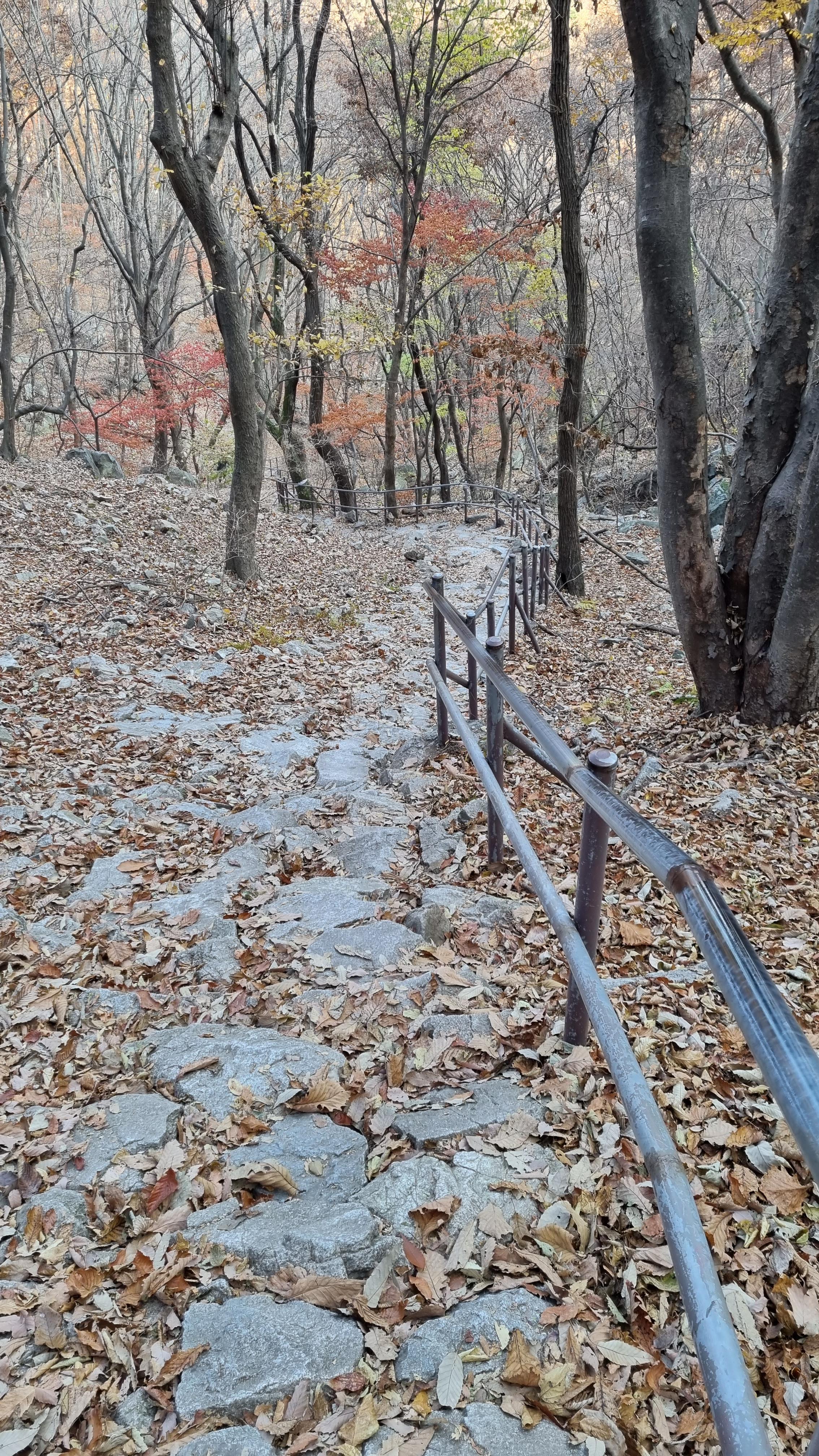 미타암으로 내려가는 공식 난이도 '어려움' 구간. 매우 가파르고 돌이 미끄럽다. 돌계단이 아니라 미끄럼틀...스틱 대신 난간 붙잡고 내려감.