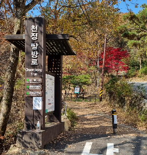직진하면 동학사, 오른쪽 골목으로 들어가면 천정탐방지원센터가 나오는 갈림길에서 오른쪽으로 간다. 펜션건물을 지나면 입구가 나온다.