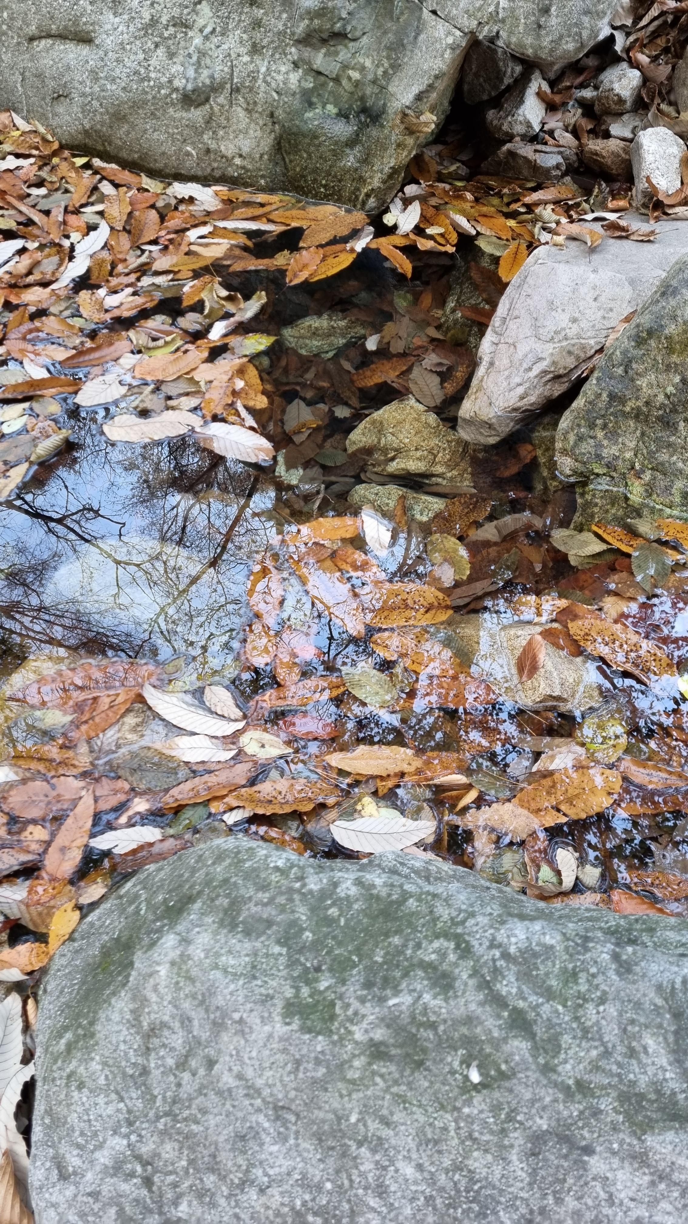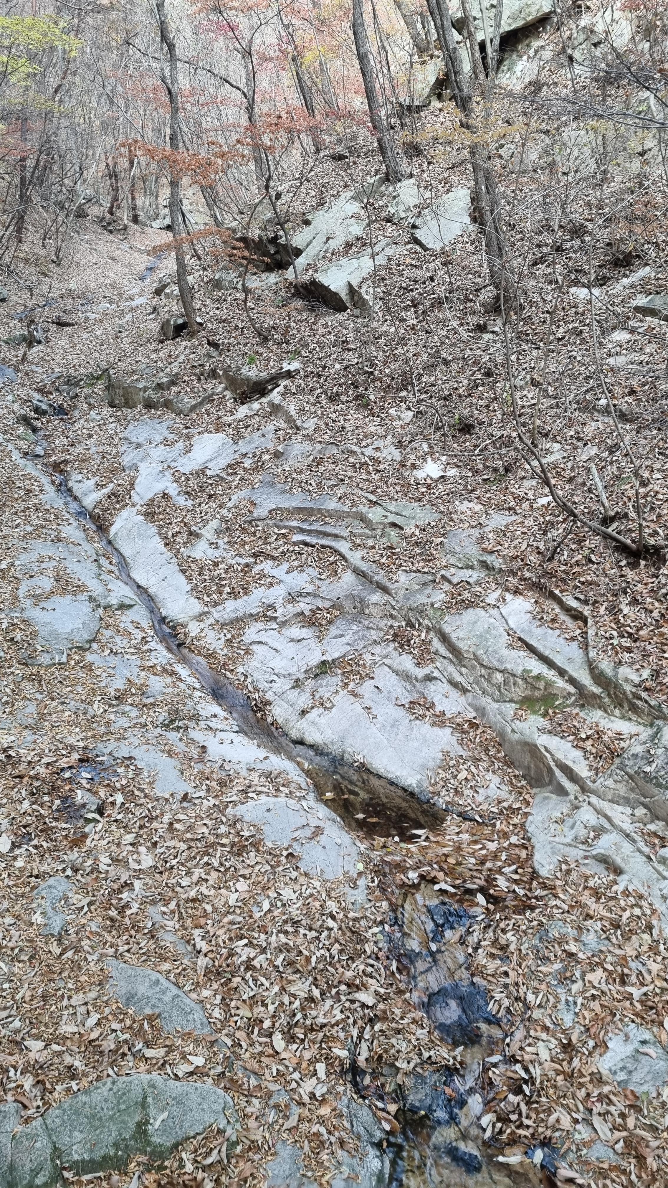 계곡도 돌과 낙엽이 쌓여있어 물이 사라지곤 한다. 중간에 고여있는 것처럼 보여도 일정량은 흐르고 있고 심지어 물고기도 있다.
