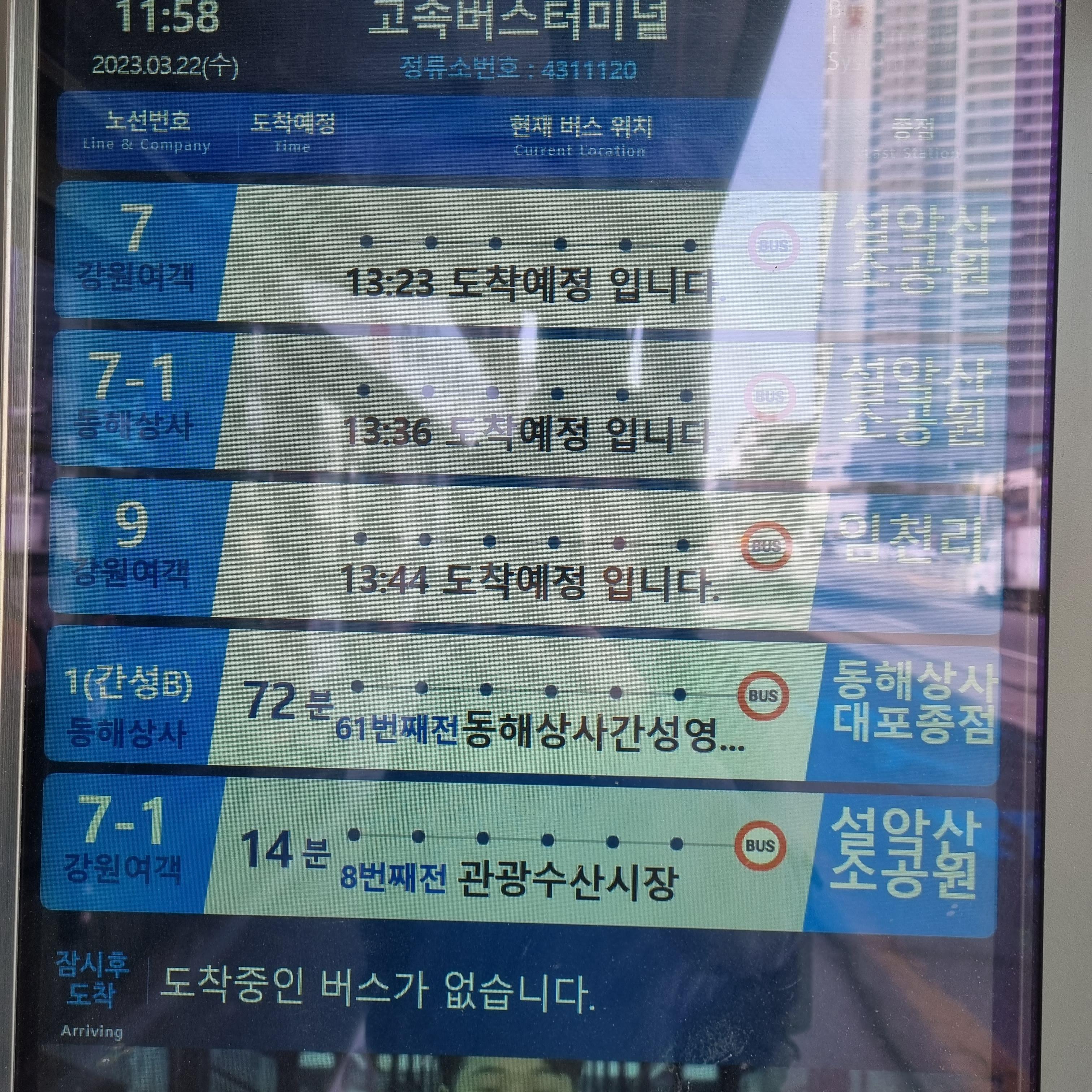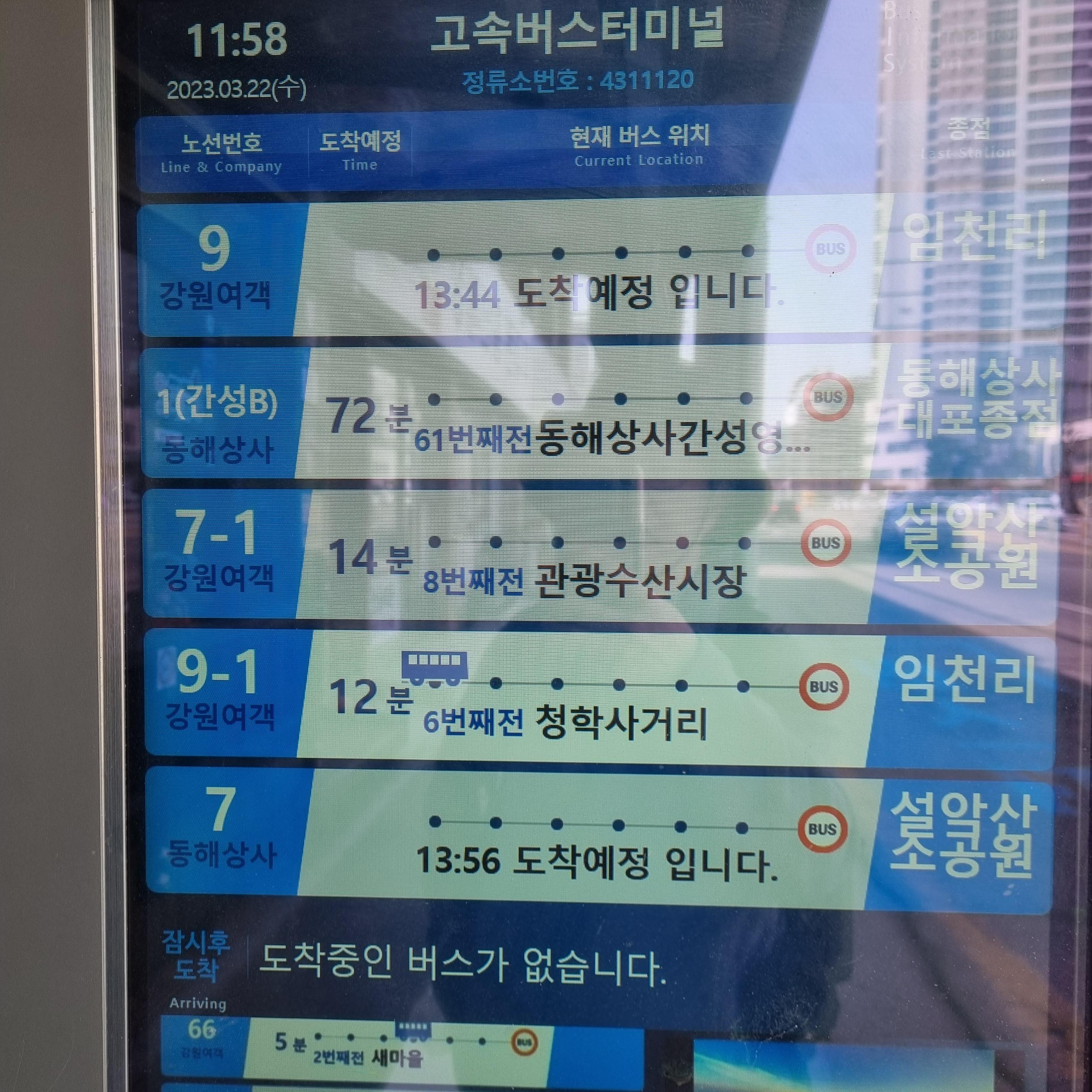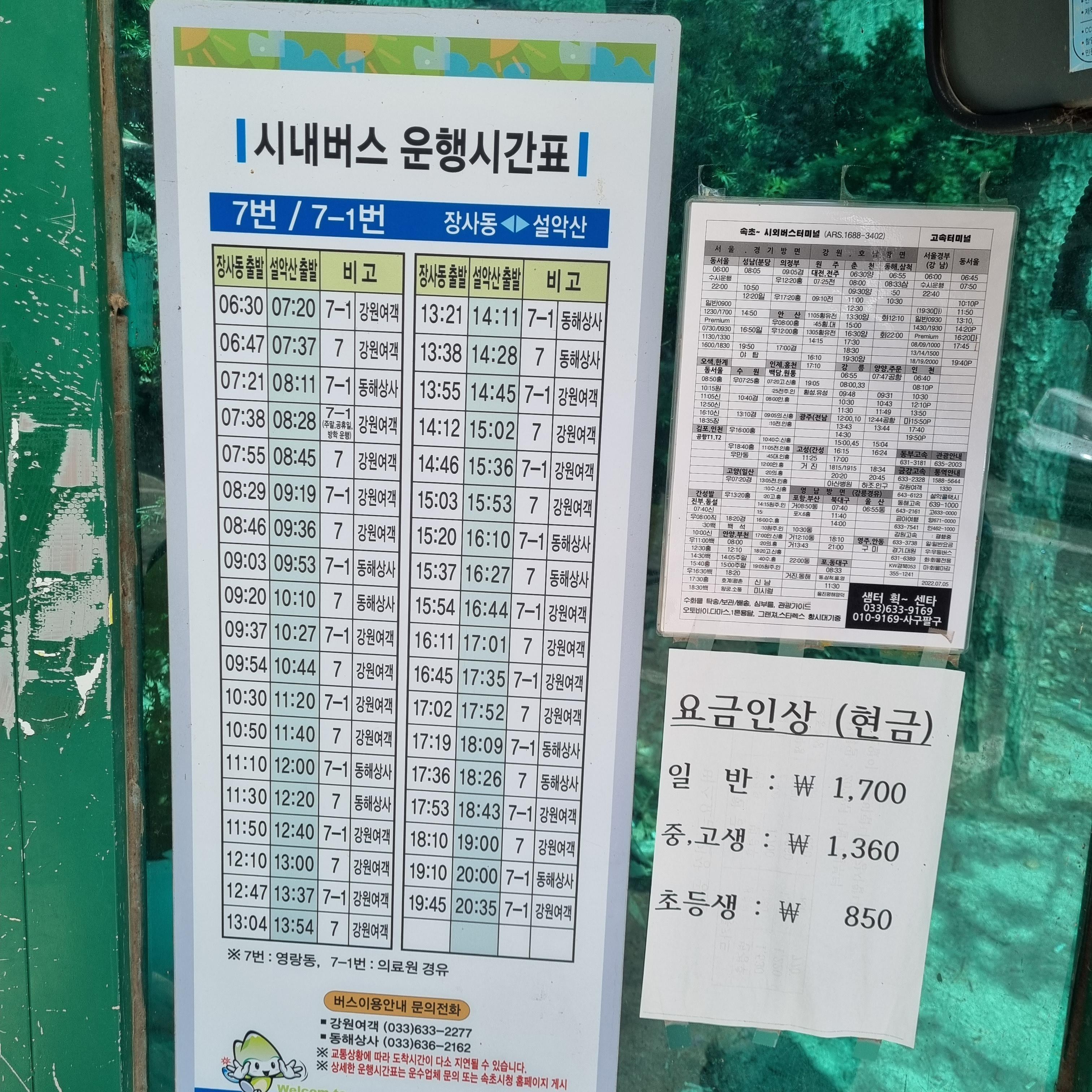 소공원 정류장에 버스 시간표가 있다. 버스는 정류장 보다 좀 더 앞에 바닥에 표시된 위치에 선다. 안내시스템에서 7-1번이 온다고 했는데 내가 탔던 버스는 왜 7번이지... 같은 번호를 강원여객과 동해상사 두 회사가 운행한다. (강원여객은 1921년, 동해상사는 1927년 설립된 회사라고 한다. @.@)