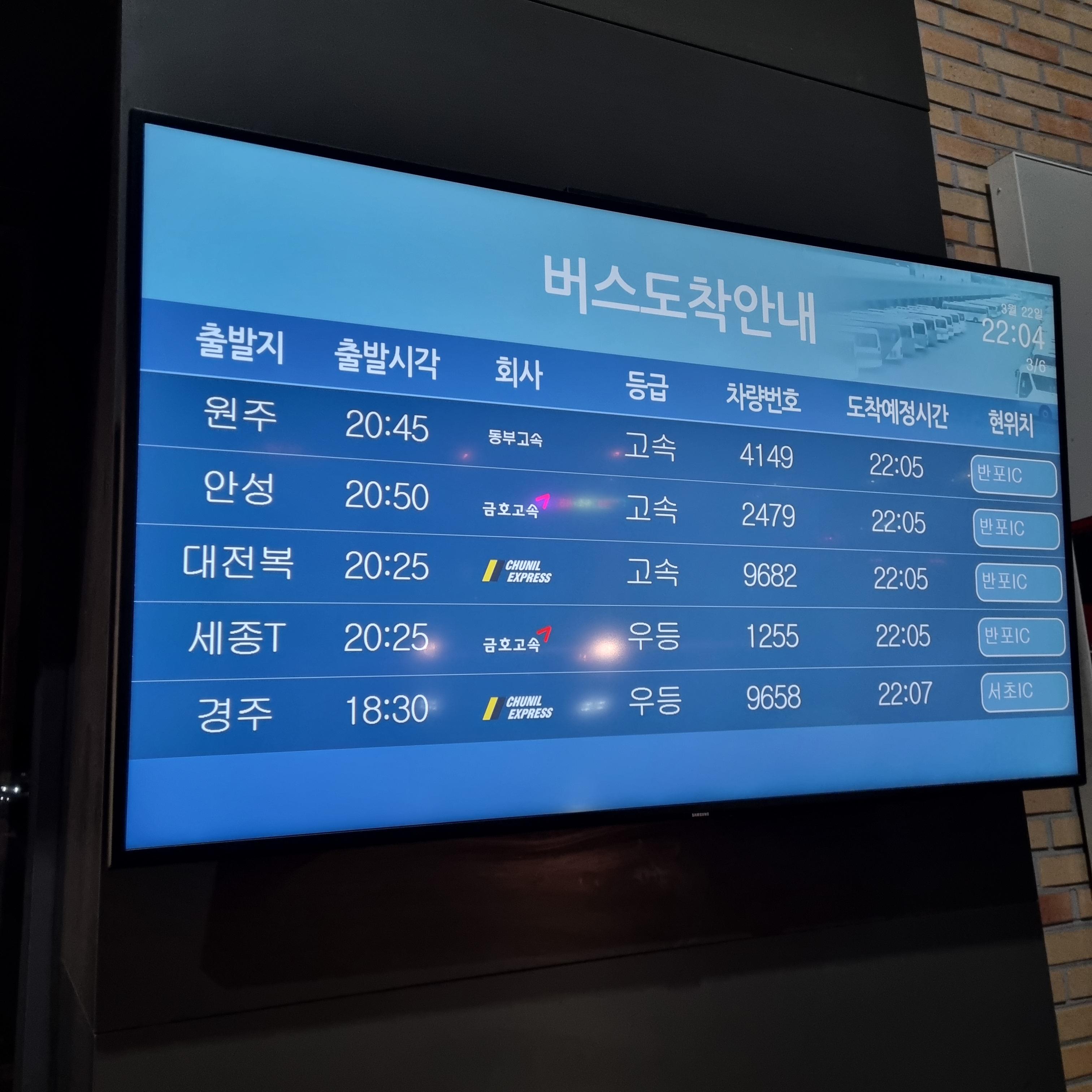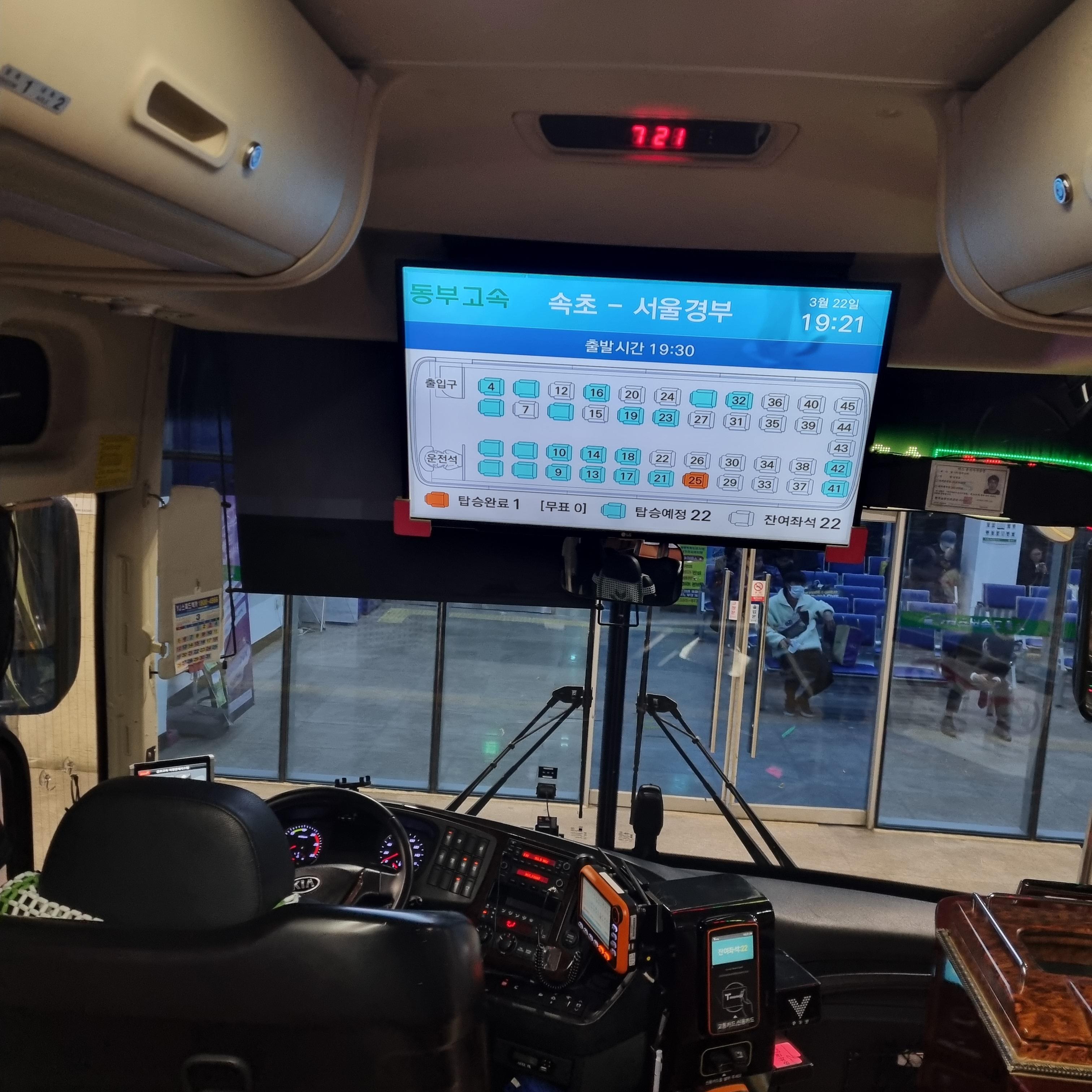 돌아오는 버스는 일반 고속을 탔다. 사람이 별로 없어서 두 자리 모두 차지. 모니터는 예약좌석과 검표(QR코드 리더기 이용) 상황을 보여준다. 일반은 단체를 만날 경우 매우 피곤할 것 같다. USB 충전기까지 설치된 신형 버스였지만, 승차감은 우등에 비해 살짝 떨어졌다.