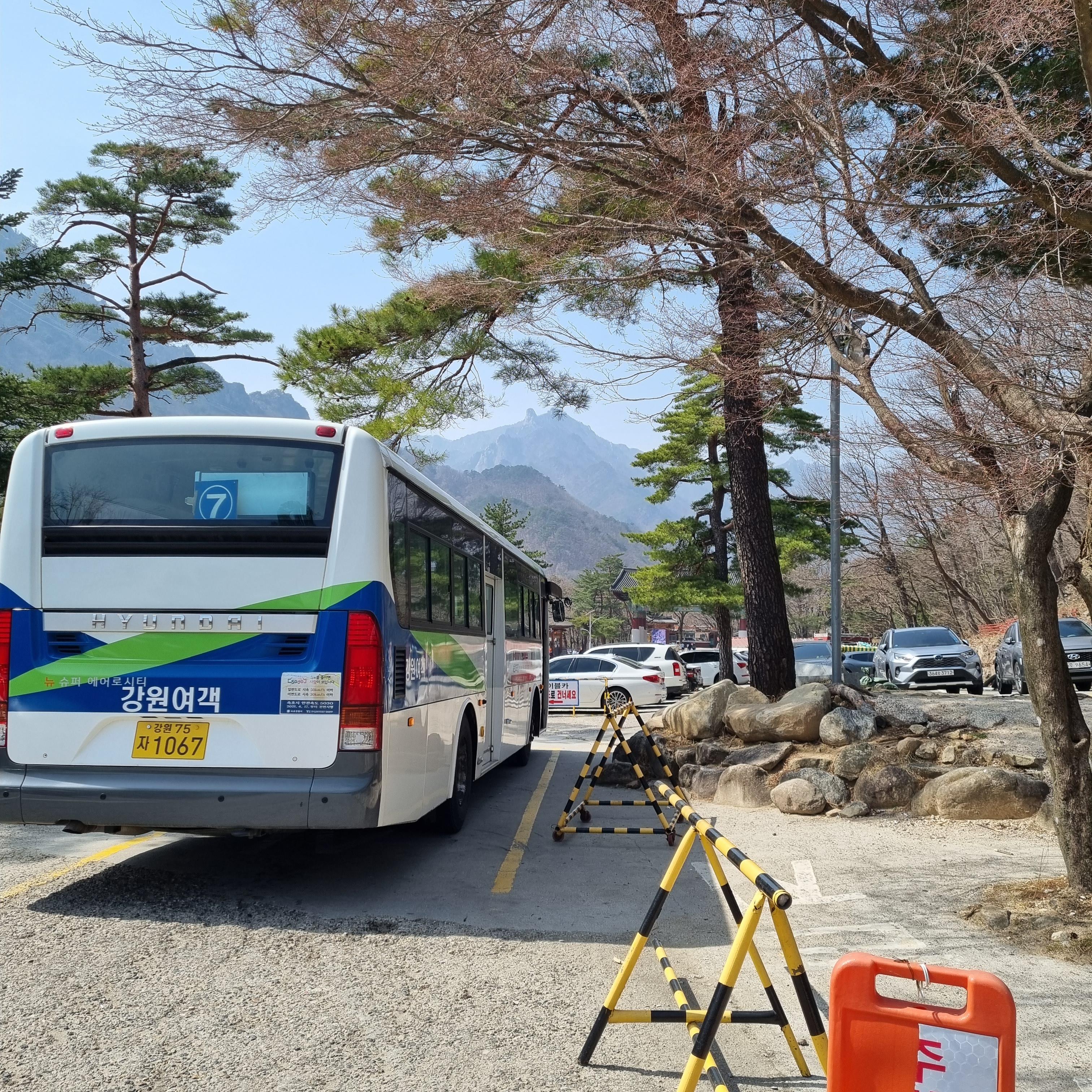 터미널에서 나와 오른쪽으로. 횡단보도를 건너 7번이나 7-1번을 타면 설악산 소공원으로 간다. 1시간에 3~4대 정도 다니는 듯 하지만 12시 조금 넘어서는 거의 한시간 정도 버스가 없다. 지도에는 50분이 찍히지만 실제로는 30분 정도 걸렸다. 나는 기둥을 붙잡았고, 또다른 여행객은 앞의자 손잡이를 꽉 붙잡고 있더라...